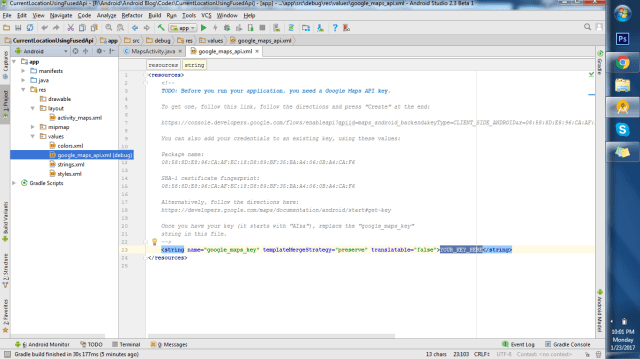 Step 5: Goto Values folder and open “google_maps_api.xml” file. Inside this file, there is string which says “YOUR_KEY_HERE”. Replace this text with your API key.